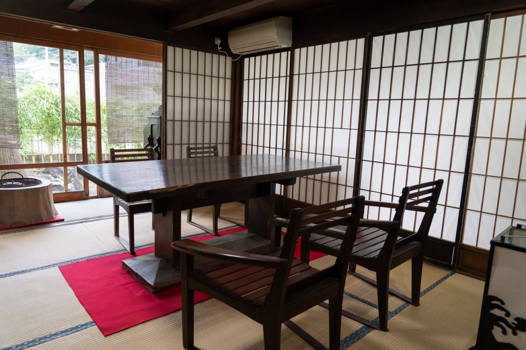 蕎麦処「多賀」の店舗は、静岡県函南町軽井沢の豪商であった大井五左エ門の築約200年の建物です。この建物を日向利兵衛(1874実業家)が、ドイツの建築家ブルーノタウトを工事の監督として、昭和5年、熱海市多賀に別荘として移築されたものです。