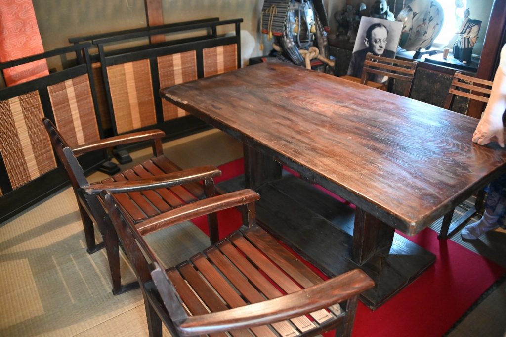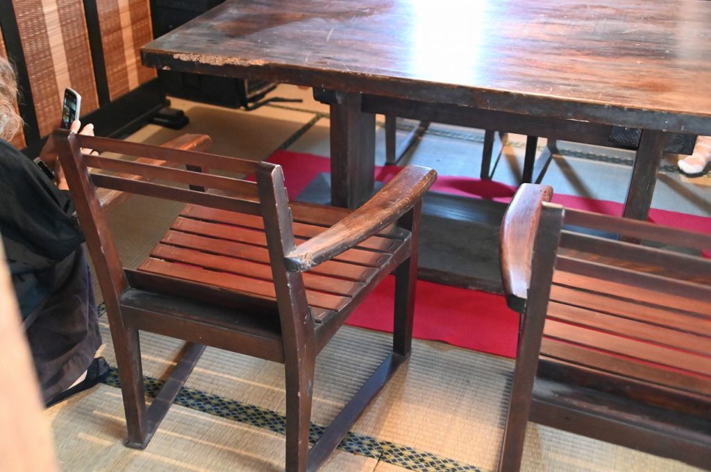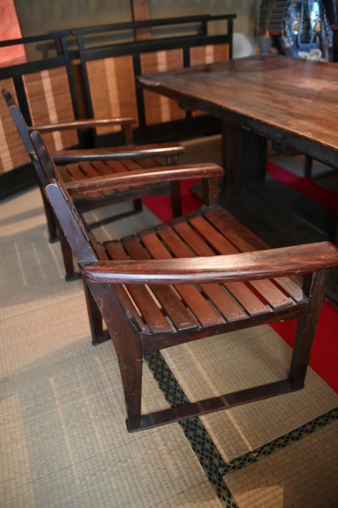 座板は巾50mmほどの板罪で両端が胴線で止められ、フレキシブルになっており、座るとかなり沈んで、クッションとなり快適である。幅は大きく肘掛けもゆったりしている。