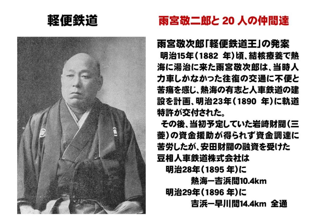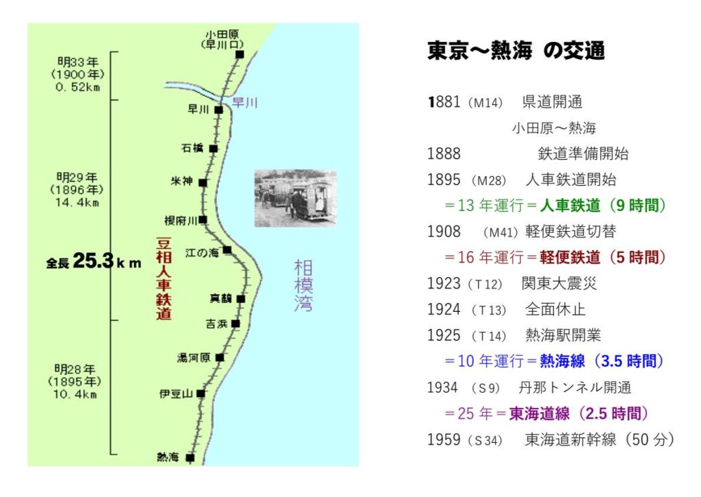 熱海は温泉の湯治場として発展してきました。なかでも江戸時代は徳川家康に愛され、歴代の将軍にも愛用され、江戸庶民の人気も上々でした。明治になると新政府の高官、文人墨客、事業家の人気となり賑わいました。このように魅力の地である熱海ですが弱点は、交通の便の悪さでした。その対策にあけくれたという意味で、「熱海の発展は交通の発展の歴史」といえます。馬、籠、から人力車に始まり、その後の人車鉄道→軽便鉄道では雨宮敬次郎が活躍しました。しかし関東大震災により壊滅し、その後1.5年のあいだ、小田原~熱海は公共輸送が皆無となり、大正14年熱海駅が開業まつしかありませんでした。 しかしドン詰まりで先がない熱海更なる発展はありませんでした。当時東西を結ぶ鉄道は、東海道御殿場線でした。しかしこの線は高い標高の箱根峠越なければならないという大きな問題を抱えていました。大正2年に丹奈トンネル事業が決定され大正7年着工し、想像を絶する困難、犠牲を払い予想を超える時間をかけ大正9年12月開通した。これ以降熱海の交通は一気に便利になり、更に昭和39年新幹線か開通するに至り、現在は交通の便が良い代表的な温泉地となった。