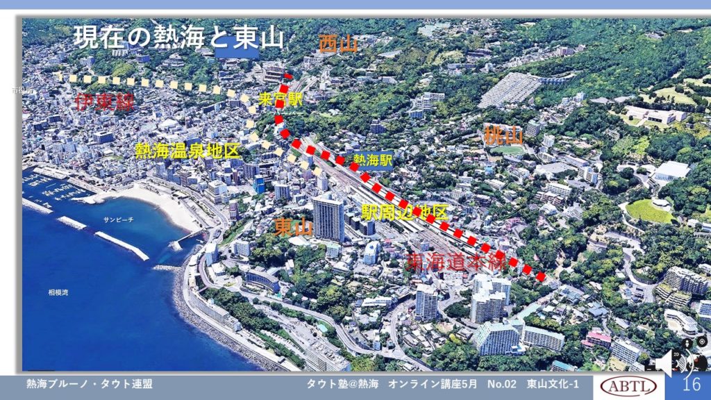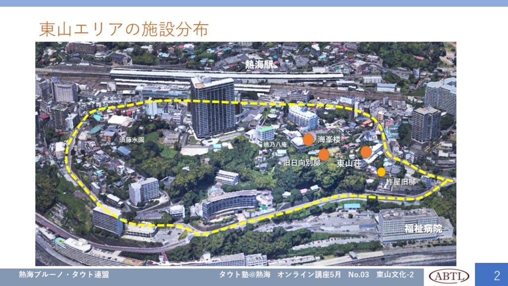 熱海の東山は丹那トンネル開通を期待され開発され、現代熱海をつくった場所です。多くの事業家が競って別荘を建てました。その一つに現代に国指定登録有形文化財「東山荘」があります、そしてその隣に同時期に建てられたブルーノ・タウト設計の重要文化財「旧日向別邸」があり、その隣にタウトを敬愛する隈研吾氏設計の「海峯楼」がありグループとなって相模湾を見下ろしています。熱海ブルーノ・タウト連盟では、この不思議な縁で隣接している3つの施設を「東山(ひがしやま)トリオ」とよび、この地域を現代熱海誕生の歴史的文化地区として、熱海の新たな観光保存広報地区として、三施設が共同してその不思議、魅力を広報しています。