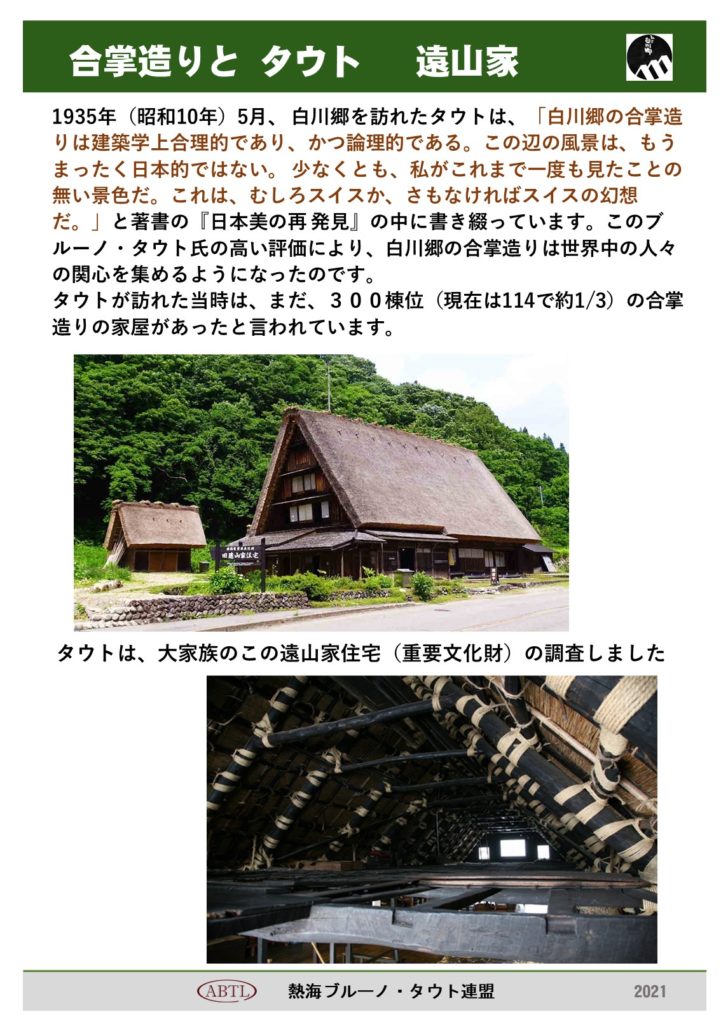 ブルーノ・タウトは昭和10年(1635)5月18日白川村を訪れ、合掌造りの群れを見、遠山家住宅(重要文化財)を見学し後に「日本美の再発見」を著わした。日本美の再発見は、日本のみならず世界に紹介され現代でも愛読されている名著である。そしてそれはユネスコの「世界遺産白川郷」誕生へとつながった。